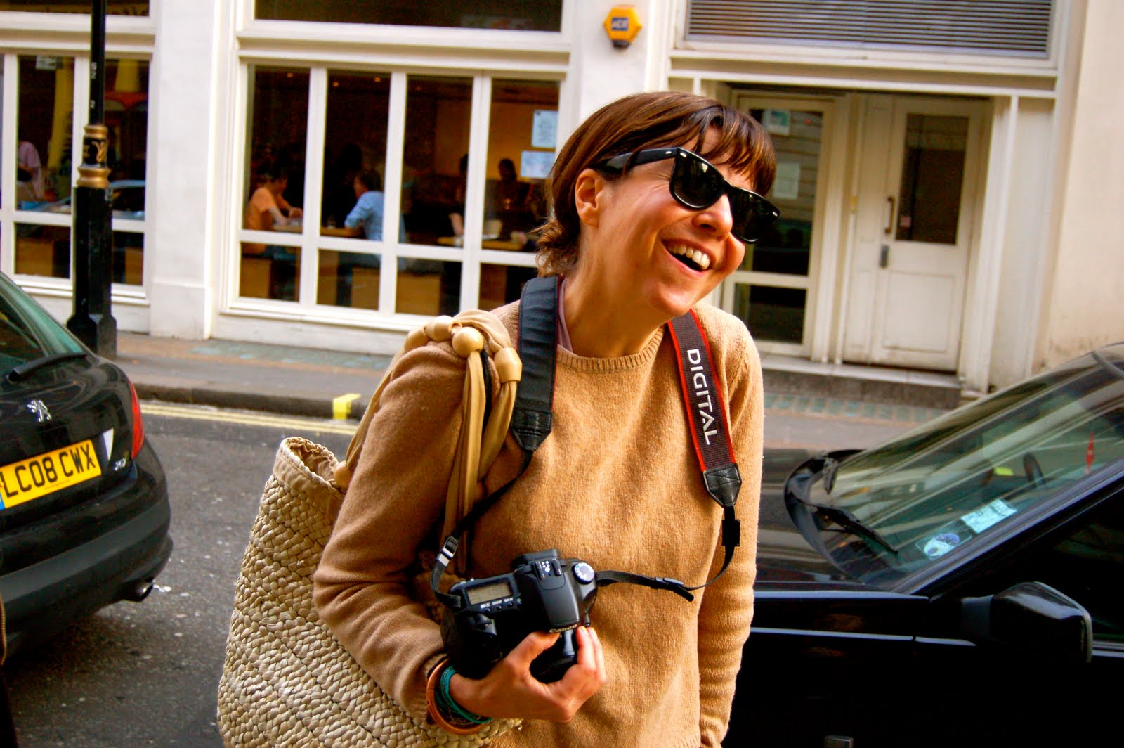 Jill of Street Style London (pics by polka dot) is, without a doubt, one of the most inviting, warm spirited, and generous people I know. She has got an amazing eye for style, incredible vision and is so determined. Totally modest and the most outgoing person. To me, this photo captures her perfectly... carefree laughter, moth eaten jumper, layered bracelets, camera in hand, neutral shades, her current favourite colour (lavender) just peeking out around her neck, natural bag, vintage raybans, ready to take on the world and looking for her next 'jump victim'.