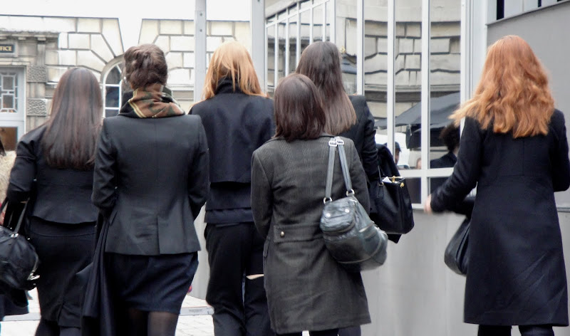 blending in does not seem to be the overall goal of most individuals at london fashion week. you don't want to be a fly on the wall, you want to be that stylish person, front and centre who has a flurry of photographers on them. you want to be noticed and remembered. not easily forgotten and not one of a crowd. you want to wear something that stands out, that has people asking, 'who are you wearing?' with such anticipation that when you mutter, 'uhh... h&m' they are left flabbergasted. only a total fashionista could find such a great designer-inspired item at such a great price. alas, the case was not such for this black-clad on-a-mission fashion pack. which makes me love them all the more. their united blackness somehow wound up looking fresh and unique.