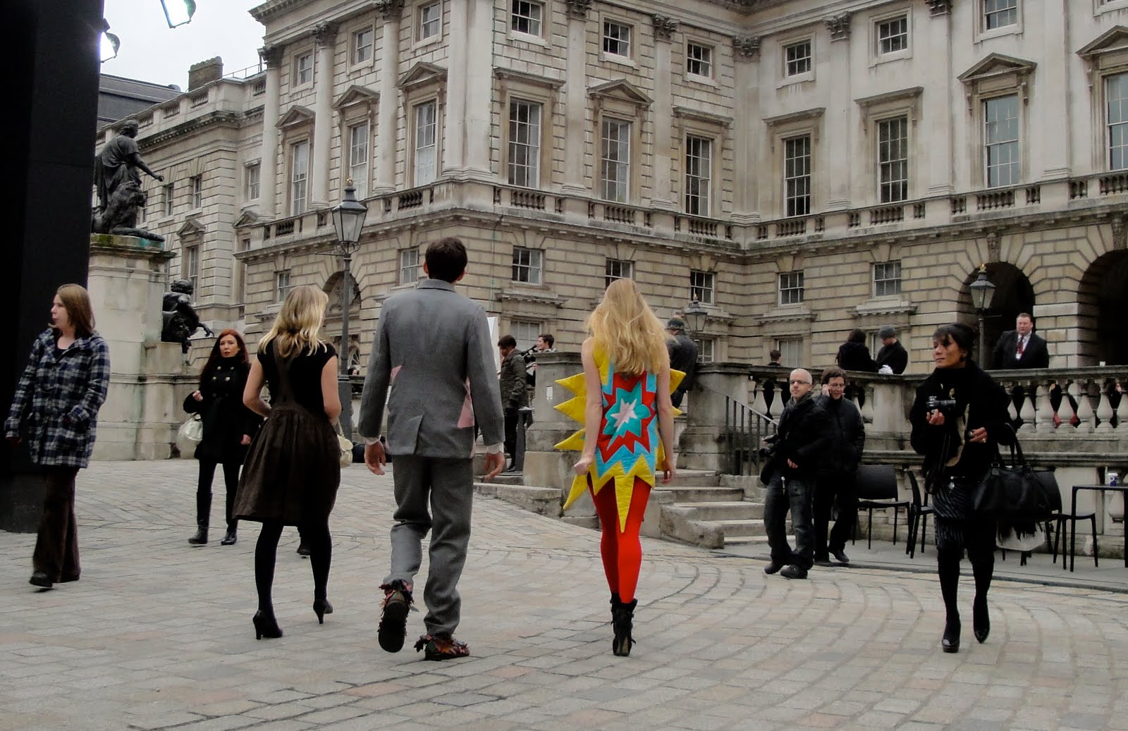 explosive outfits at LFW... i can't remember who these were designed by, anyone know? i think the man's jacket is pretty cool and if it were made in darker hues it could actually be pretty wearable (notice his shoes? their barely in shot, i didn't realize how funky they were when i spotted this pair, i was too focused on their outfits). don't think this is a trend that is going to be taking over the high street anytime soon though... although it is pretty funky. definitely unique and eye catching. these two grabbed everyone's attention.