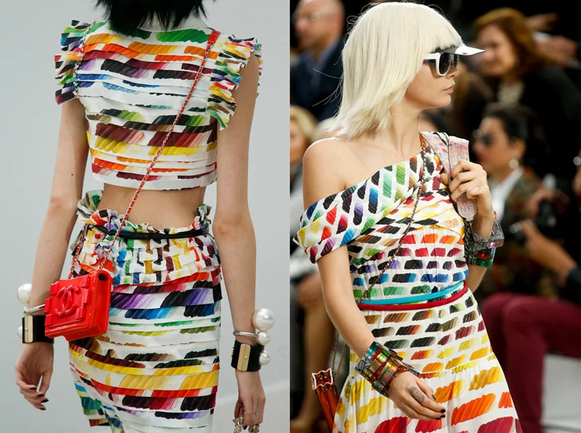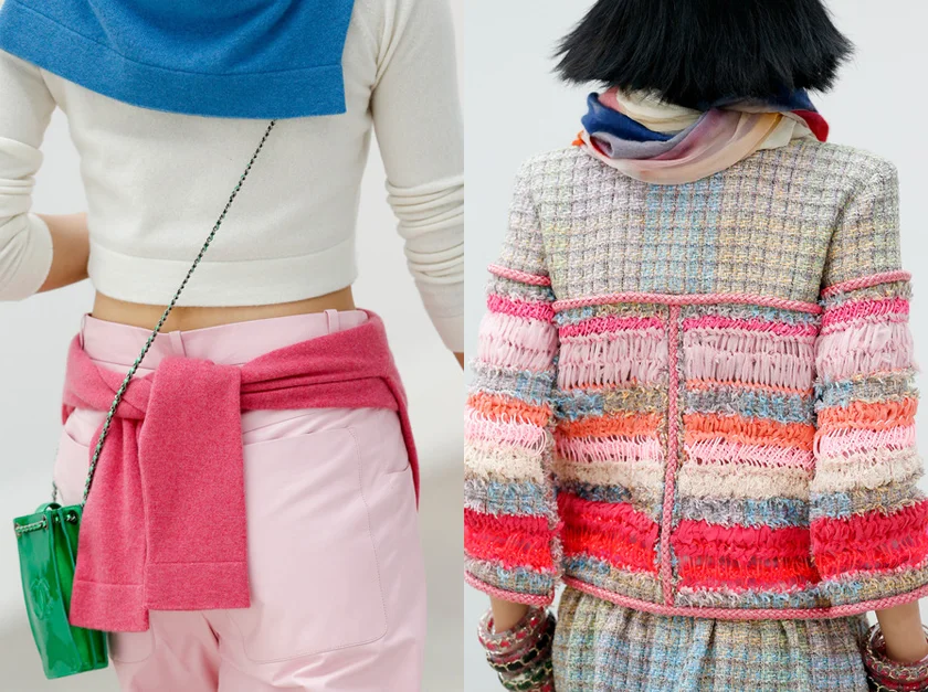 Uncle Karl taught us a few key things about next season. First, don't leave the house unless you've got at least two bags on. You can opt for a backpack (attach multiple carabiners and ropes) paired with a mini cross-body for your phone. Or, grab two little quilted numbers firmly by your hand for a multicoloured look. Wrap a barely-there belt around the outside of your jacket. Continue to show off your midriff (start on the crunches now) and layer on lots of chunky plastic bangles. Wear a pair of ribbed socks with your heels. Rock a slew of rainbow colours in one look. Pair your lace with your tweed. And, most importantly, tie your jumper around your waist back-to-front - a literal twist on the iconic '90s look.