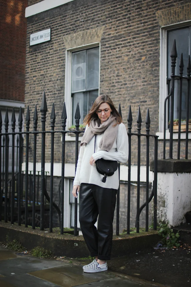 I actually shot these outfit photos back in February when I was in London. The weather was unnaturally warm at that point and I've basically been wearing the exact same outfit nonstop since I took these photos. I'm living in these Zara pleather trousers, even though they are about two sizes too big, and this cream knit from Weekday. I finally gave it a wash and got out all the blue dye that had sunk into the sleeves from them rubbing against my jeans. Spring cleaning at it's finest right there.