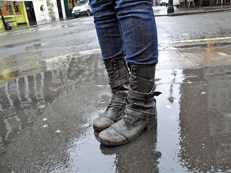 #1 is boots. Boots will save your life in the rain, but the choice of which pair is so complicated. Wellies are good but, if you have to spend a lot of time inside, wearing big clunky plastic boots can be a bit of a pain. These leather boots that Meera is wearing are great. Wet jeans, wet feet, cold toes... all not an issue. Plus, they are totally cute. Grey shoes are huge at the moment and I love the worker lace up look they have. The little straps around them are so cool too, and completely remind me of this idea posted on london street style.