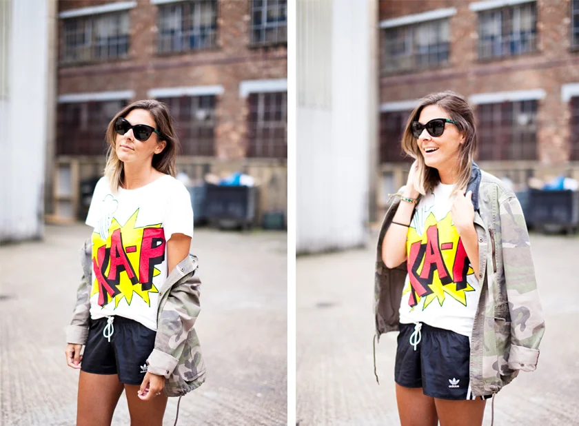 Wearing: 3.1 Phillip Lim t-shirt from My Wardrobe, River Island camouflage jacket, Adidas shorts and Dolce & Gabbana sunglasses.