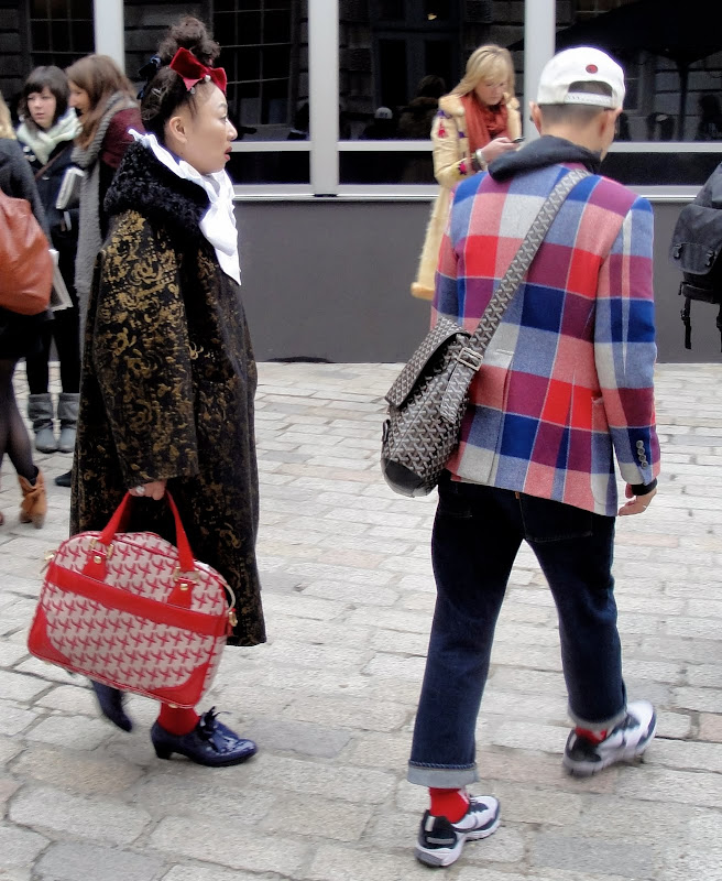 what they wore and what i saw in the first 10 minutes of stepping into somerset house on day 5 of LFW... clashing prints, brocade, plaid, red socks, pops of white, dual-toned print bags.