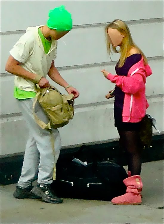 Neon Uncategorized Nov 18 Written By Jennifer Inglis These kids are pretty decked out in neon gear. She's even got neon slouchy ugg boots. That's some pretty hard-core 80's love. I wonder if they went to some sort of quasi-rave the night before? Jennifer Inglis