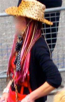 Leopard print trilby. Multi-coloured hair. For her own sake I really hope those are extensions or attached to her hat. Polka dot scarf.