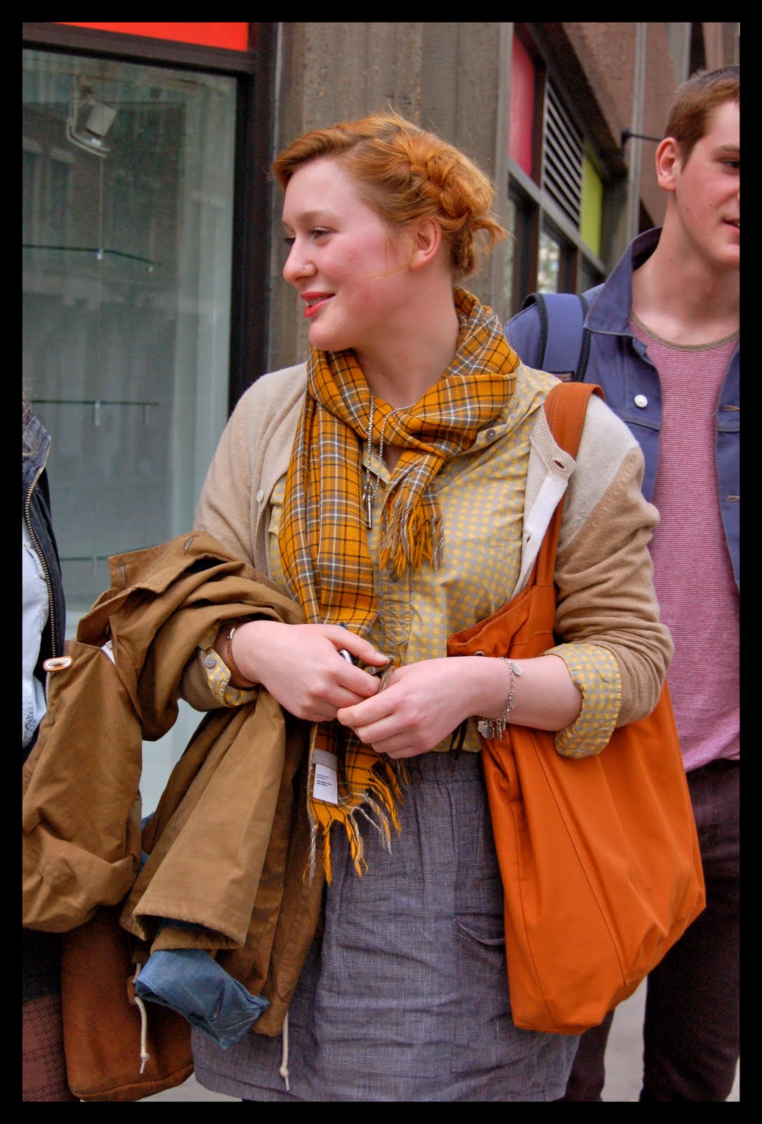 not a colour that is highly connected with spring but it is totally working on this girl. this rusty orange shade that she's got in her hair, around her neck, and slung over her shoulder is the perfect accent to her otherwise neutral shaded outfit. i just love the laid back, but very well put together, and in sync look of these three. plus, i'm totally after an army khaki jacket (like the one hanging over her arm) and wedged desert boots (like both girls are wearing). seriously covetable - a masterclass on how to put together contrasting prints and colours and a reminder that attention to detail really makes all the difference.