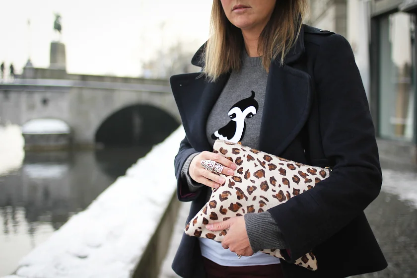 Freezing temperatures have meant that I've been staying inside cuddled up under a blanket most days. How did over a week go by without me posting anything on this blog? I've just started taking an intensive German class so my mind is tuned into arbeitens and Deutsch instead of fashion. Please accept my sincerest apologies. I still love this blog but I do feel as though I've come up against a bit of a brick wall. Does anyone else ever feel that way? I'm not sure what I want to post about and outfit shots just seem so mundane these days. How many photos can you see of me snuggled up in a warm coat? Fashion week is coming up in a few weeks so hopefully that will give me an injection of inspiration. In the meantime here's a shot of me from yesterday wearing a casual low maintenance outfit. I'm loving burgundy legs and wooly jumpers these days.