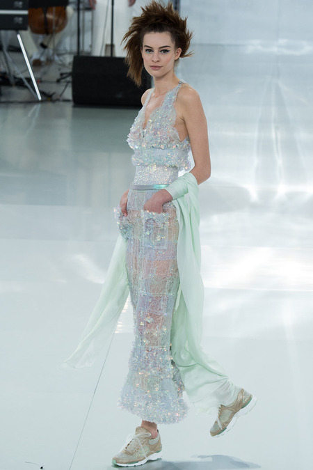 When Lagerfeld had his army of top models run down a flight of steps, as they entered the venue of Chanel's spring 2014 haute couture show, jaws undoubtedly dropped. You don't run in couture, darling. Surely you step lightly, move slowly and stay far far away from red wine and spaghetti. Not so anymore. The new breed of couture wearers, according to Uncle Karl, can now embrace sportswear just like the rest of us. Thank god they don't have to dabble in New Balance or Nike though, these girls get their sneakers from the Chanel couture collection. They're crafted by Massaro and aren't made from cotton but instead feature python, pearls and lace. Best to avoid the puddles then, eh?