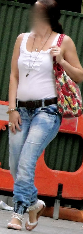 Let's be honest, most of us don't need to be wearing tie-dyed denim. None of us need to be wearing tie-dyed skinny denim with rouched ankle detailing - that is just ugly and unflattering. The whole look is relatively permissible until you get to her ankles.... okay, I said 'relatively' permissible. But seriously, avoid elasticated ankles - it's really not a good look.