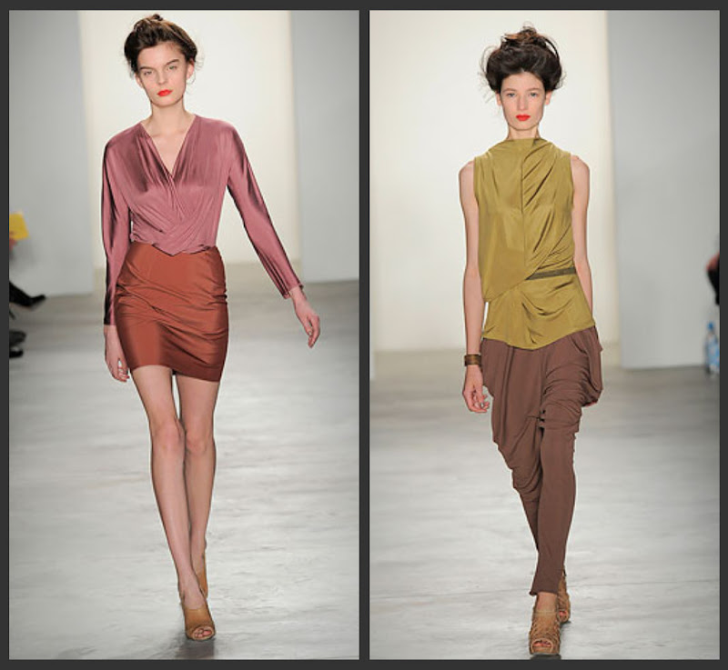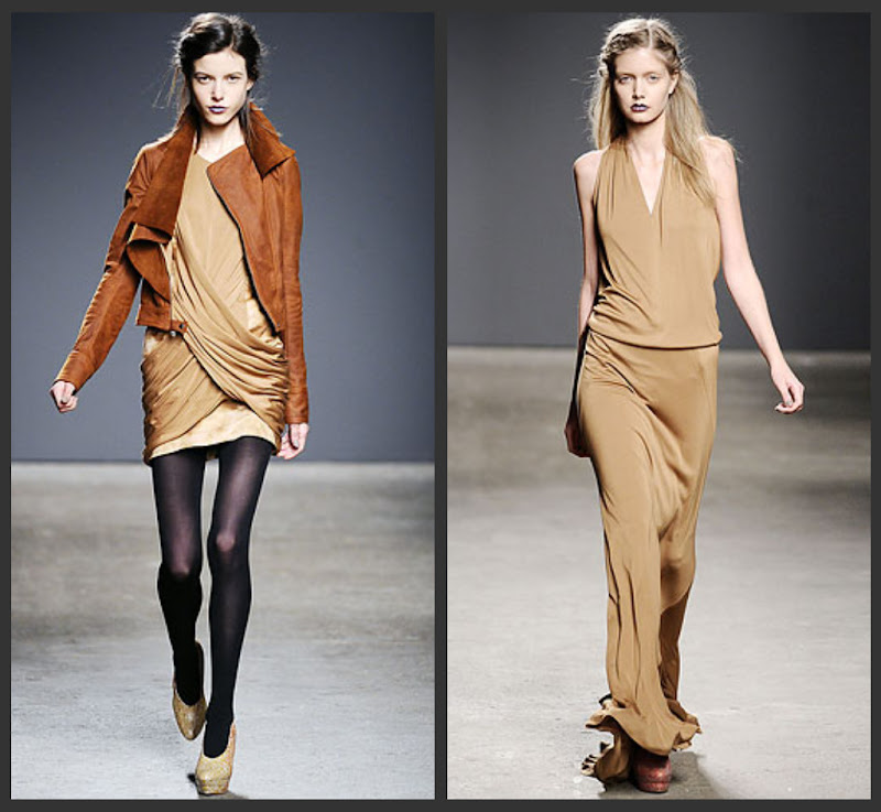Inspired by a recent trip to Japan these self-proclaimed math nerds produced an elegantly tailored and oh-so-feminine collection. The use of colour is quite simple but unexpected... with springs popular choices of pinks, and greens being warmed up to fit the Autumn mood. The shapes are so sexy in a an elegant sort of way. Not try hard, or over the top at all... there is something sort of old-school glamour about it all. I was utterly surprised by what the designers looked like when they walked on stage... but must say, their appearance makes the collection even more endearing.