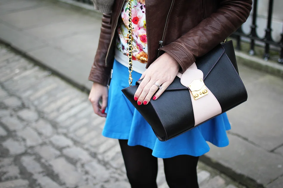 Wearing: MSGM floral sweater, Carven jersey flip skirt, Aila clutch bag, Muriee scarf and Ash shoes.
