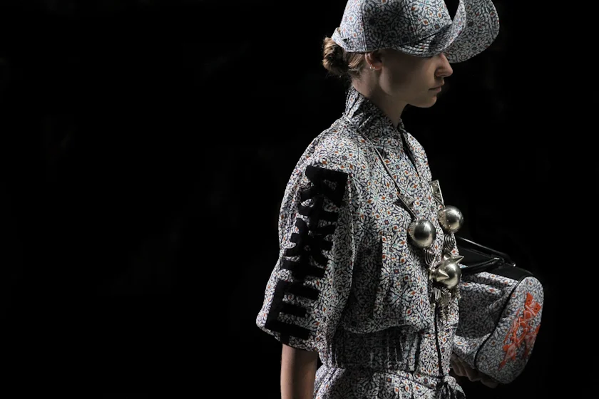 Models were weighed down by heaps of traditional style Berber jewelry. This heaviness was contrasted by a medley of soft flowing fabrics covered in stark geometric prints and pretty florals. The collection offered an amalgamation of ideas but everything flowed from a tribal and nomadic core. The extreme urban aesthetic clashed with indigenous silhouettes creating a vibe that is unique to KTZ.